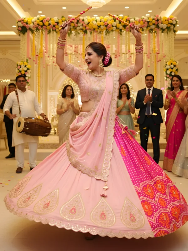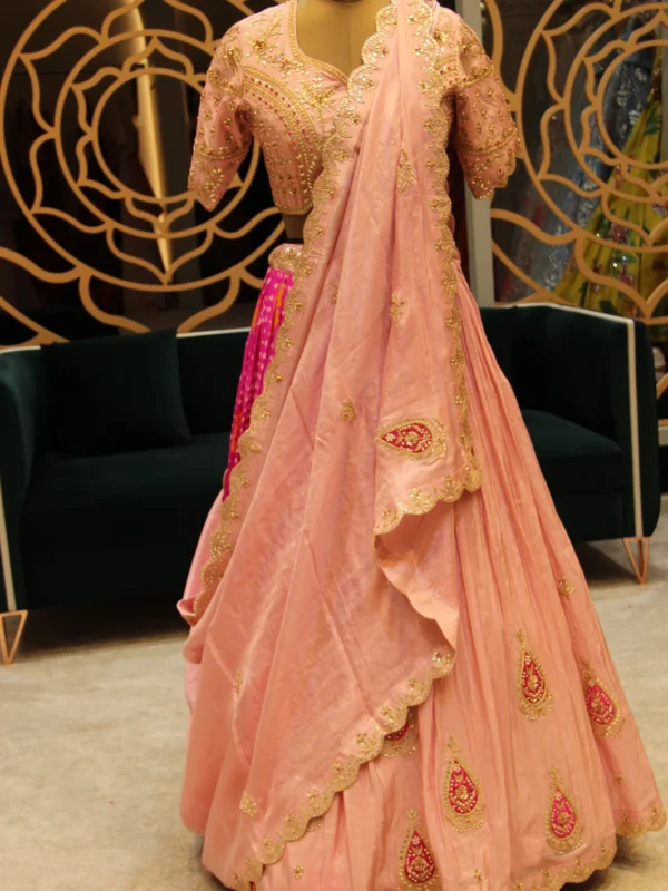 The coordinated pink blouse and dupatta enhance the ensemble’s feminine appeal, while the soft silk drape and fluid movement make it perfect for sangeet nights, festive gatherings, or wedding celebrations. Designed for the woman who loves timeless beauty with a hint of bold detail, this lehenga captures the essence of joy, tradition, and modern sophistication.