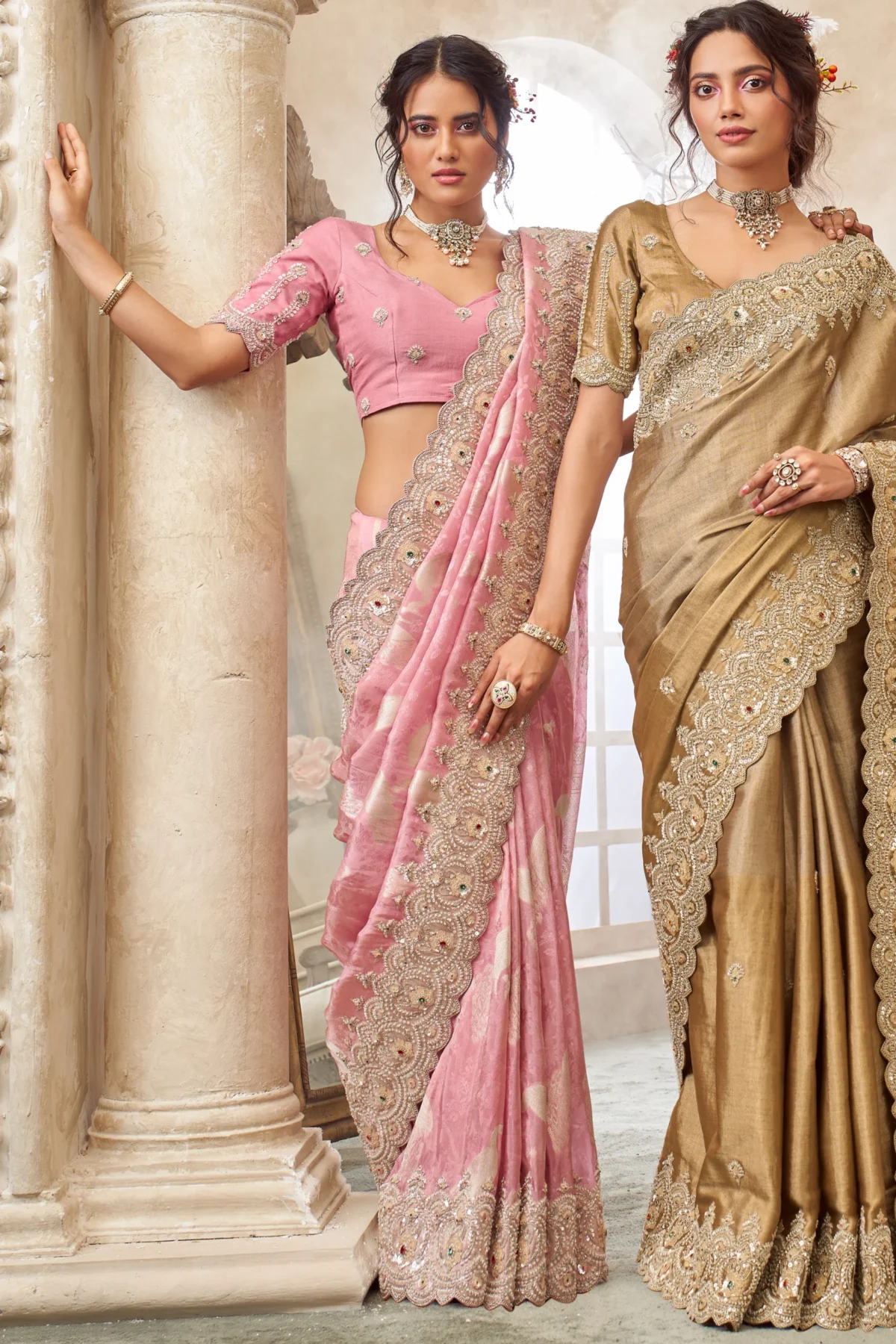 Rose-pink hand-embroidered silk saree with scalloped border and matching unstitched blouse.
