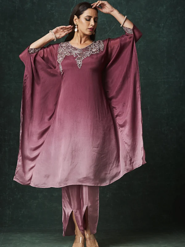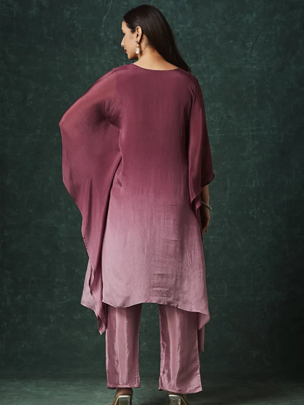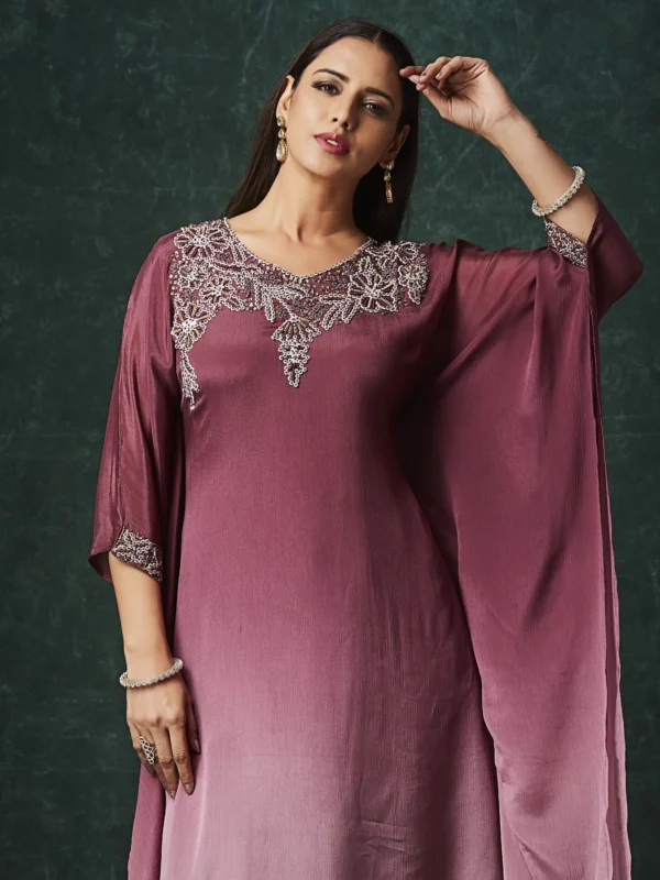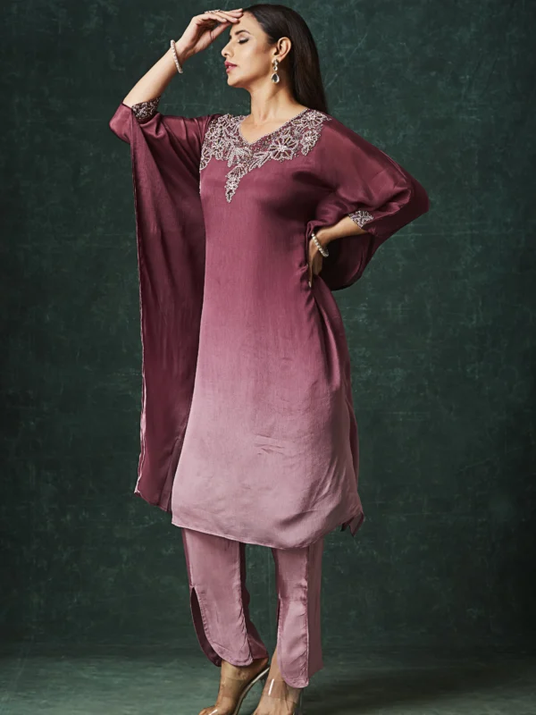 Designed in a rich rosewood mauve tone, this Indo-Western outfit features a fluid straight-cut kurta paired with coordinated slit-detail pants. The highlight of the design is the intricately embellished neckline adorned with delicate bead and thread work, adding refined shimmer without overwhelming the elegance of the silhouette.