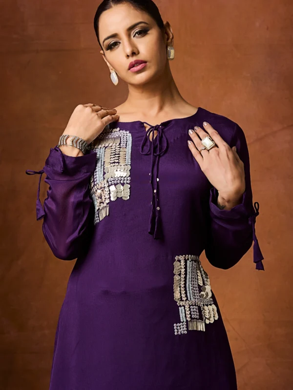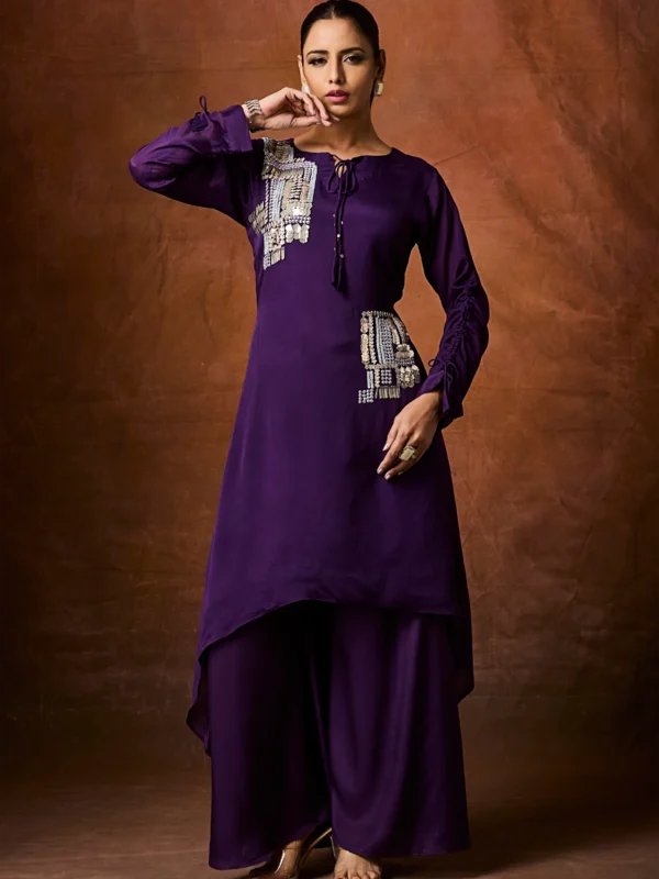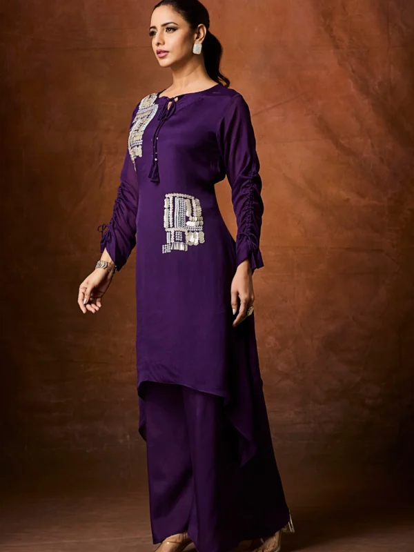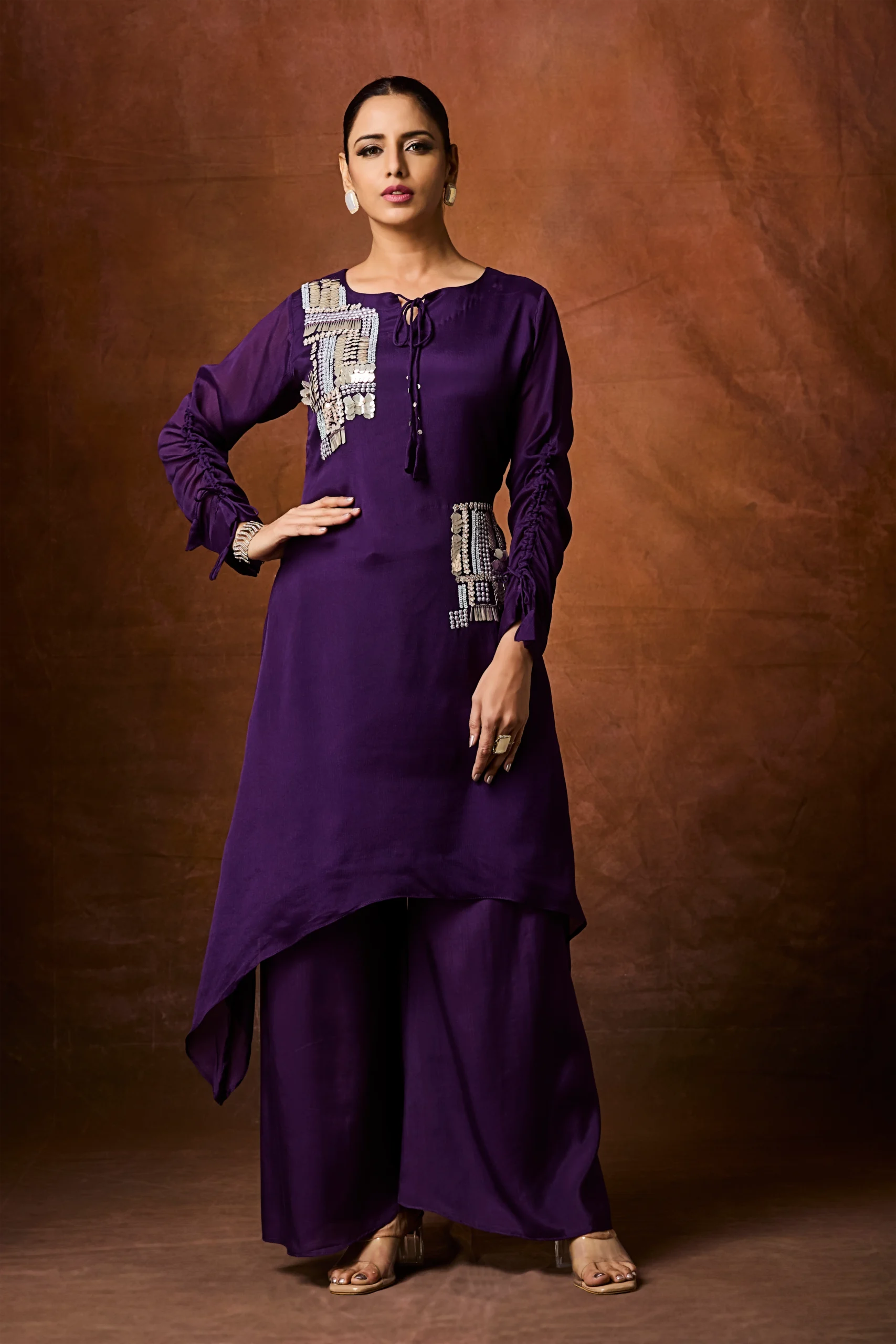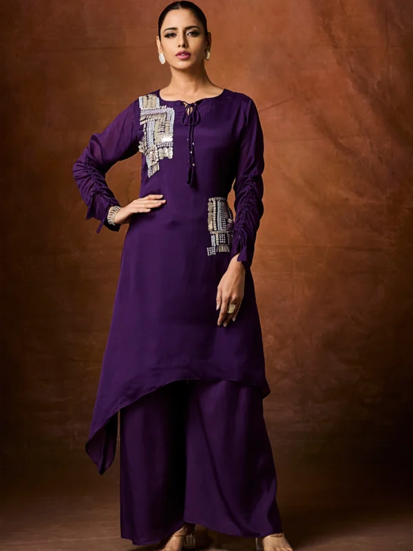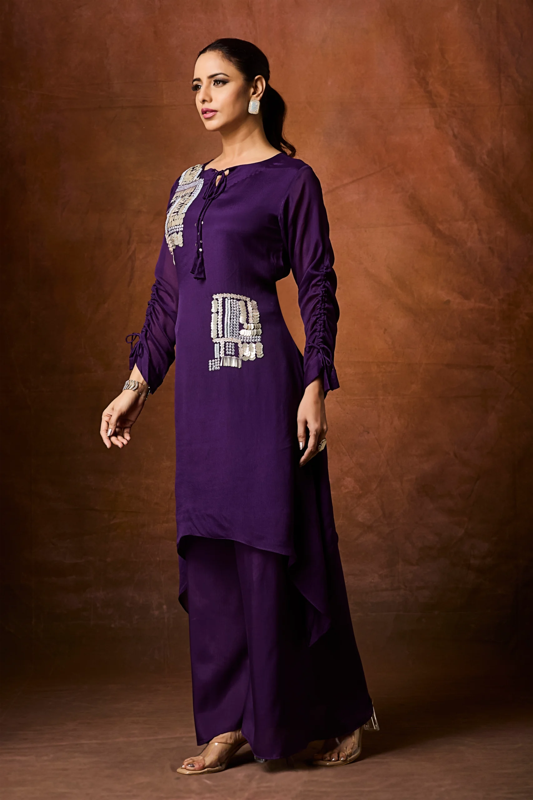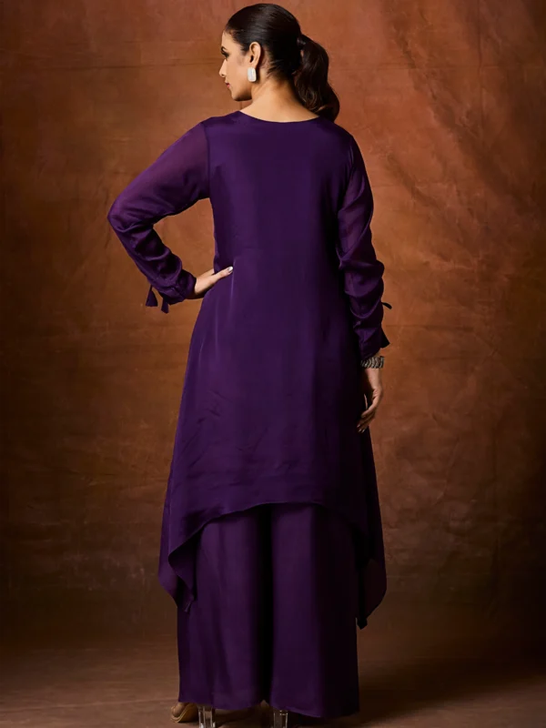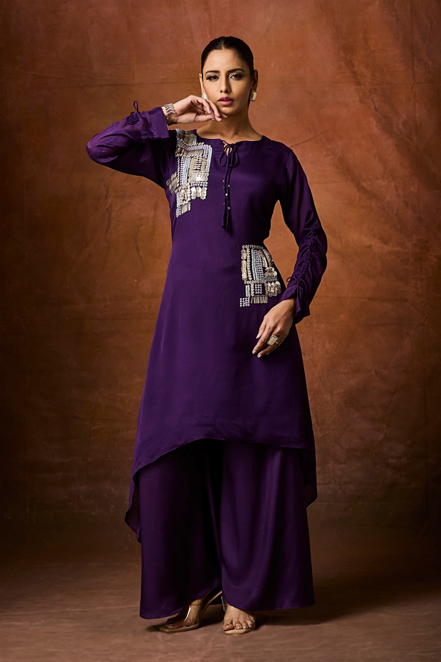 Introducing the Royal Amethyst Asymmetrical Palazzo Suit Set, a modern statement crafted for women who appreciate structured silhouettes with subtle detailing. Drenched in a deep amethyst purple hue, this ensemble blends contemporary design with artistic embellishment.