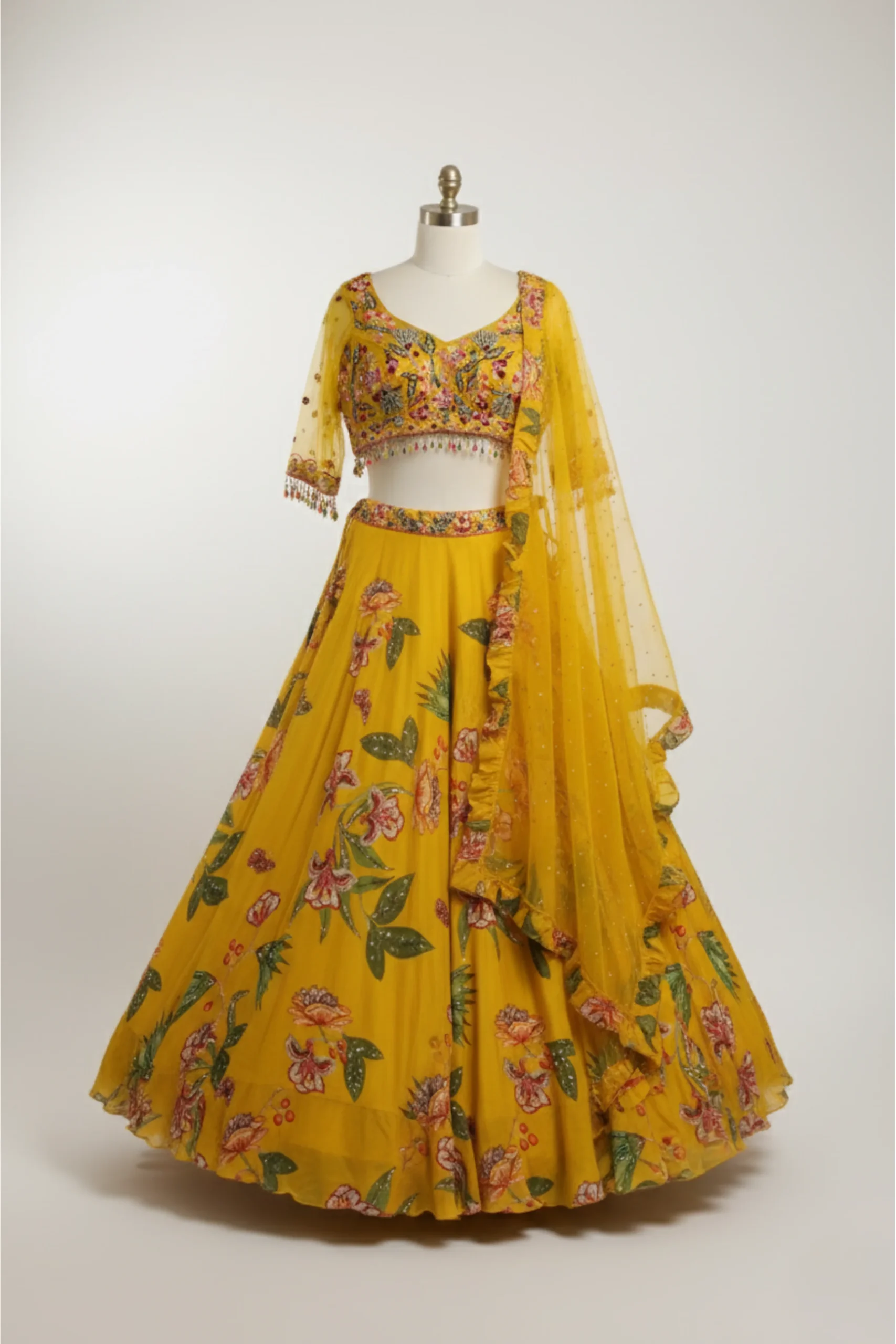 Royal blue net designer lehenga with bead and crystal embellished blouse and dupatta, perfect for weddings and evening celebrations.