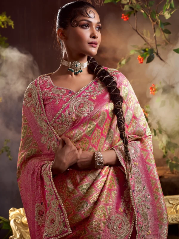 Unveil the beauty of timeless luxury with the Royal Fuchsia Mosaic Zari Embroidered Silk Saree—a masterpiece crafted for women who love grandeur with finesse. Draped in a striking fuchsia pink base, this saree showcases a mesmerizing mosaic-inspired zari weave, giving it a rich, regal character.