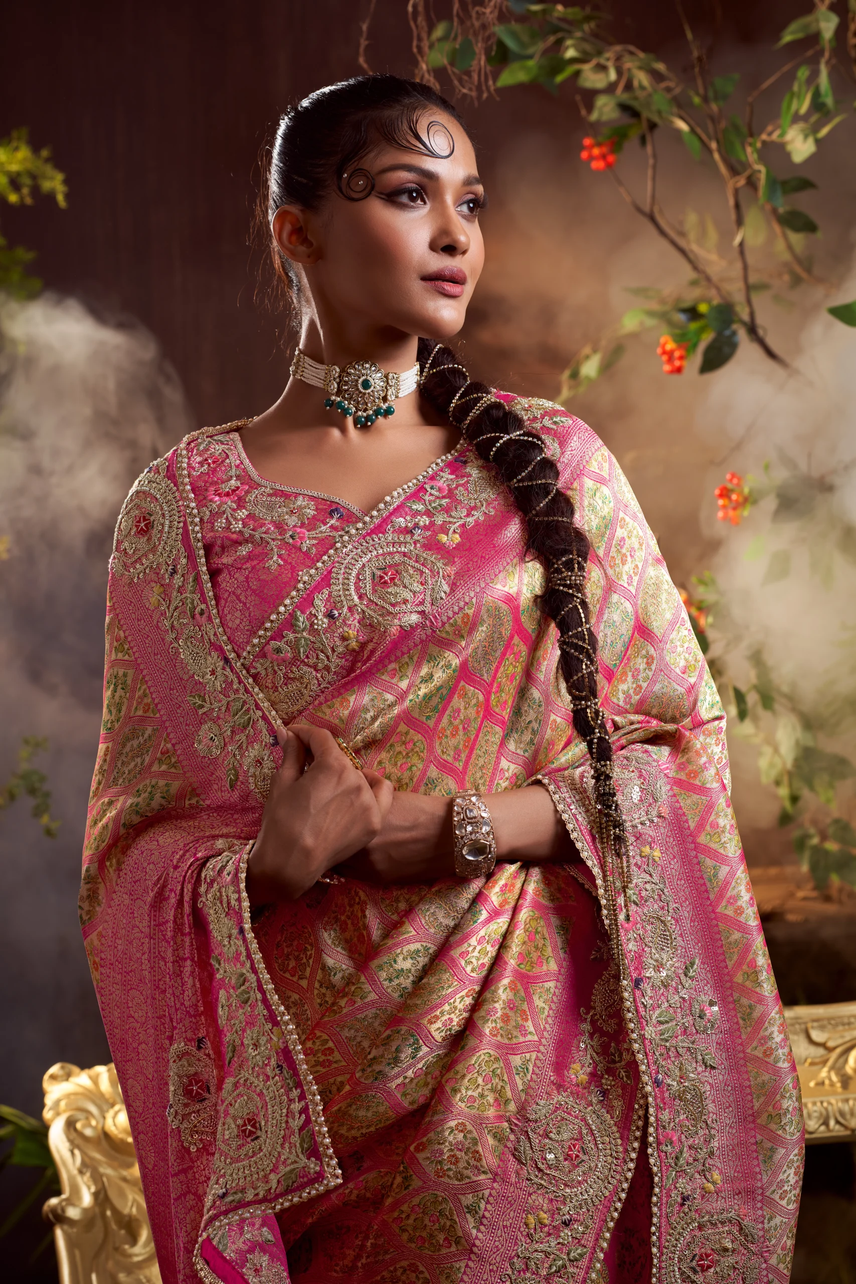 Paired with a matching hand-embroidered unstitched blouse, this saree is perfect for weddings, festive celebrations, reception looks, and all royal occasions. Every element speaks of the craftsmanship and luxury that defines an heirloom saree.