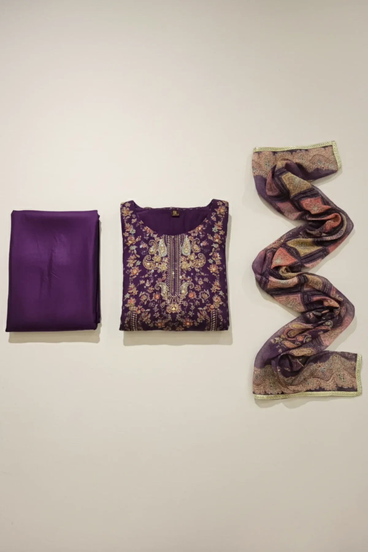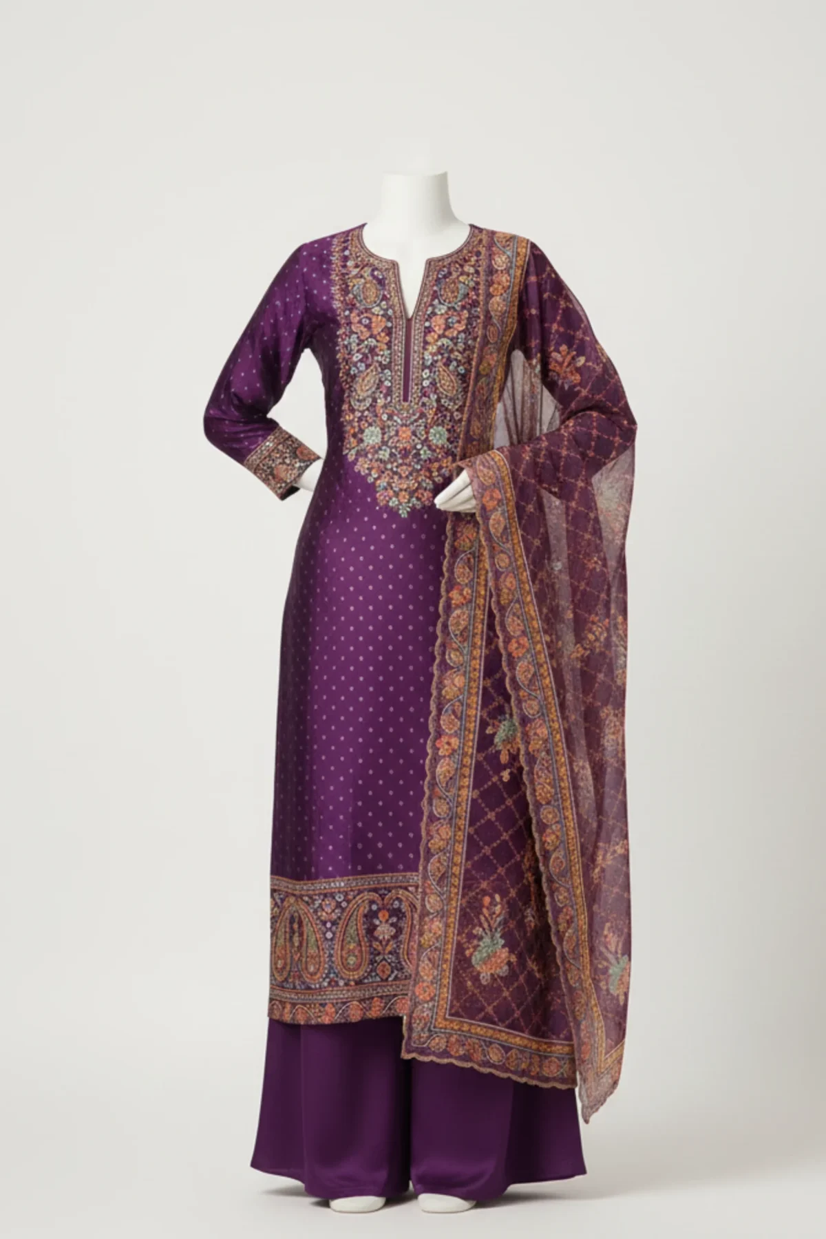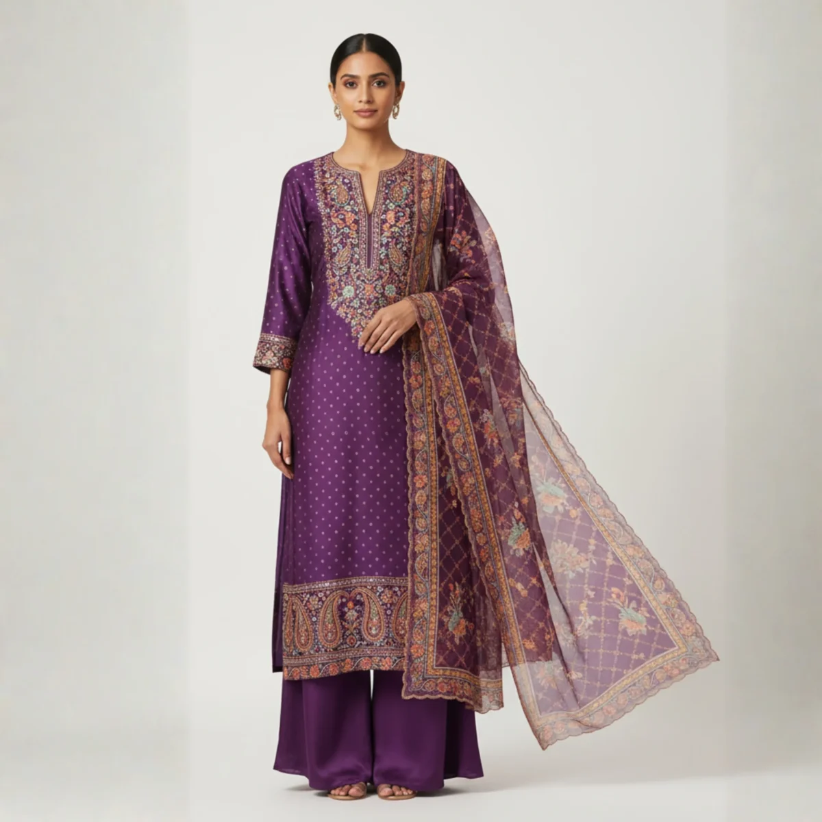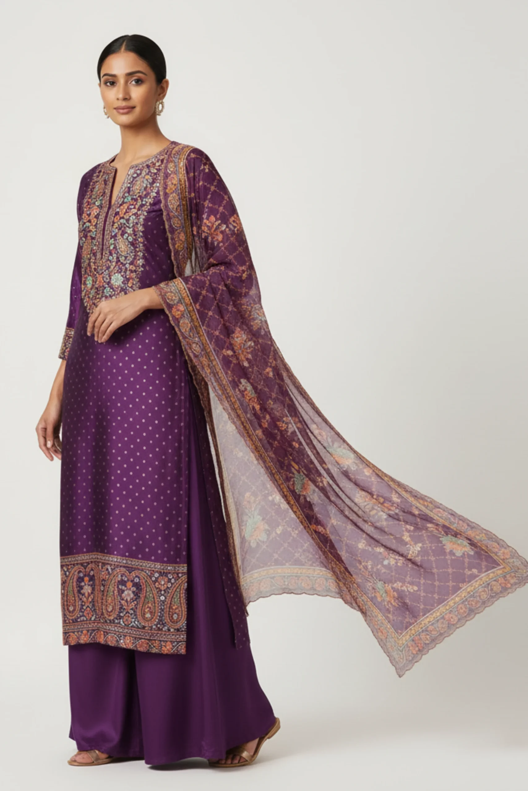Graceful purple muslin suit featuring intricate prints and an ornate neckline, perfect for festive occasions and refined gatherings.