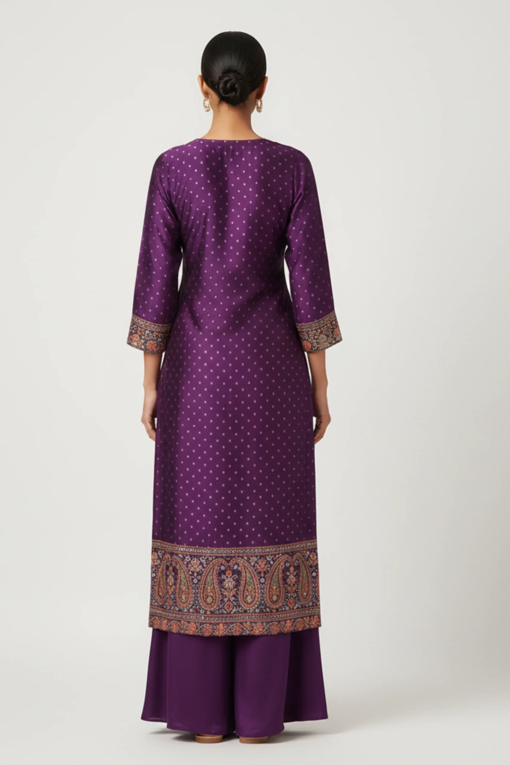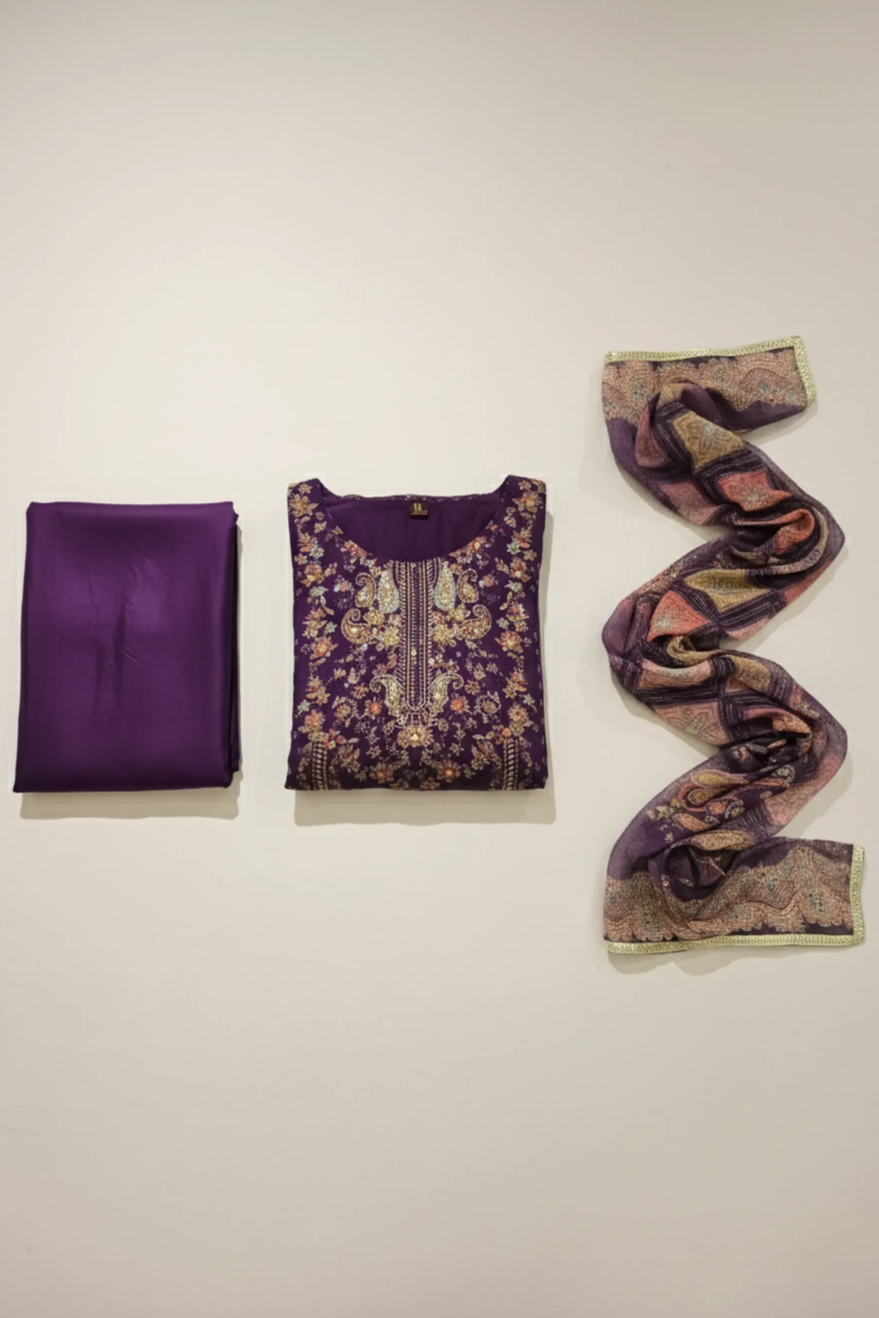 Be the first to review “Royal Orchid – Purple Muslin Suit with Intricate Print & Embellished Neckline”