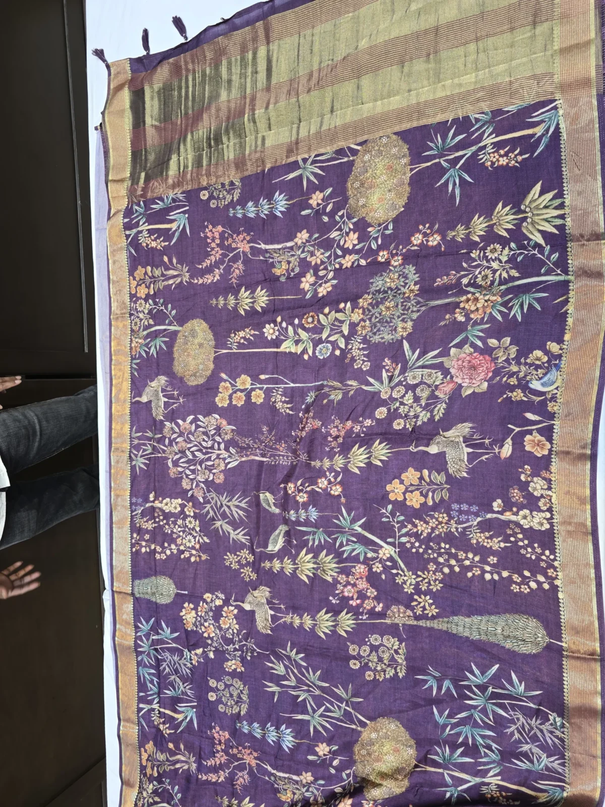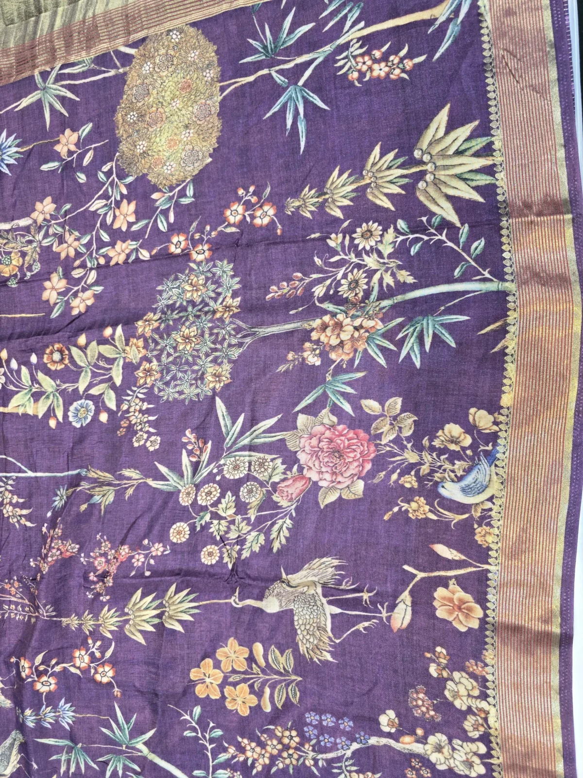Royal Purple Moonga Tussar Saree with Woven Zari Border and Traditional Heritage Print