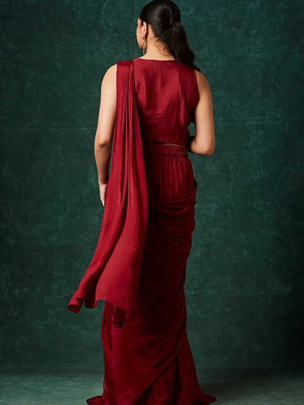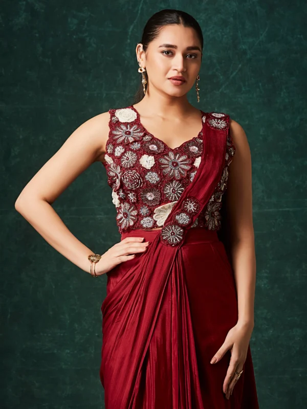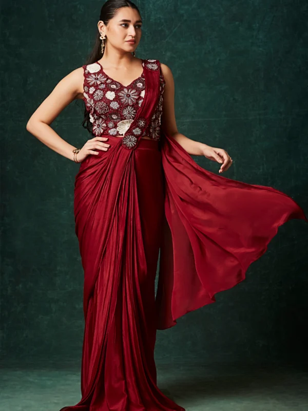 Designed for women who love structured silhouettes with dramatic movement, this pre-stitched draped saree features sculpted pleats that fall gracefully, creating a flattering, elongated frame. The rich ruby crimson hue exudes confidence, romance, and festive grandeur.
