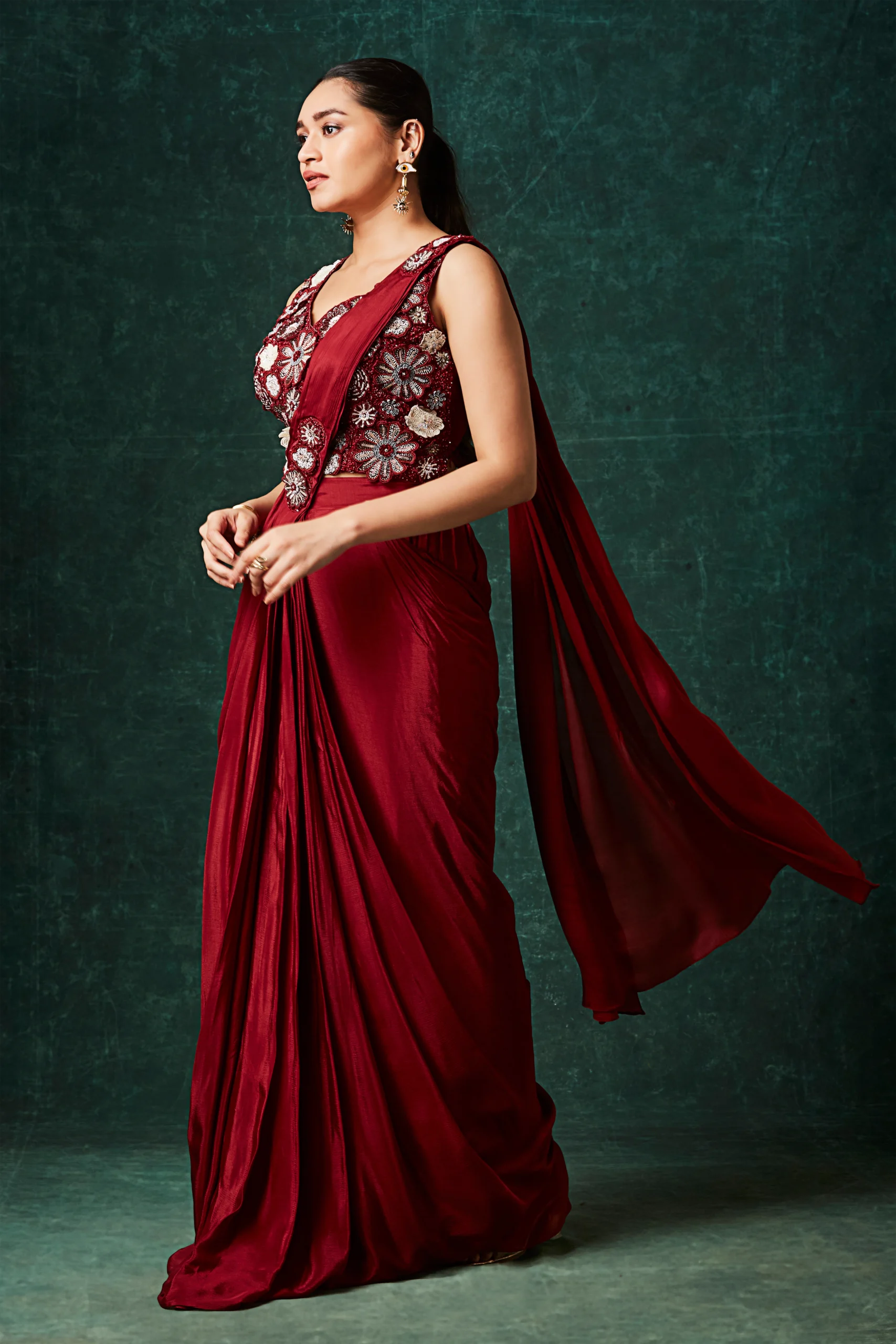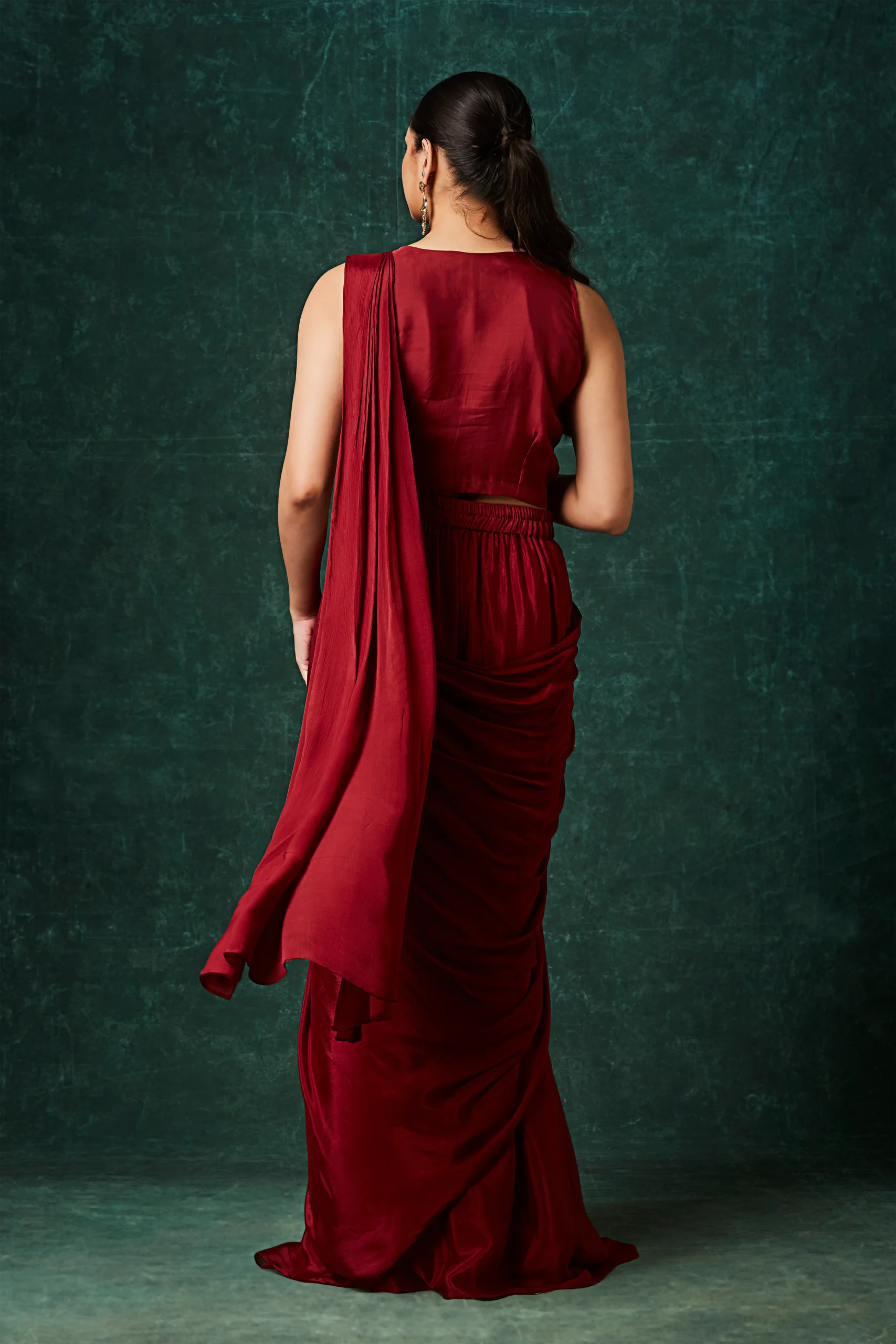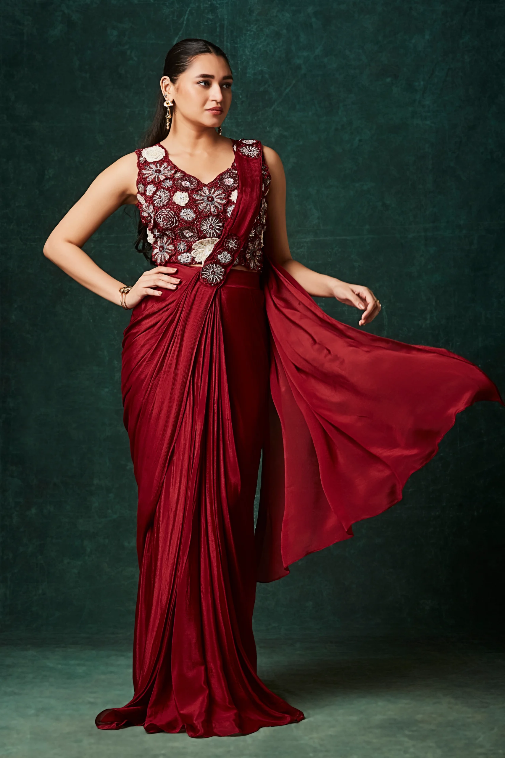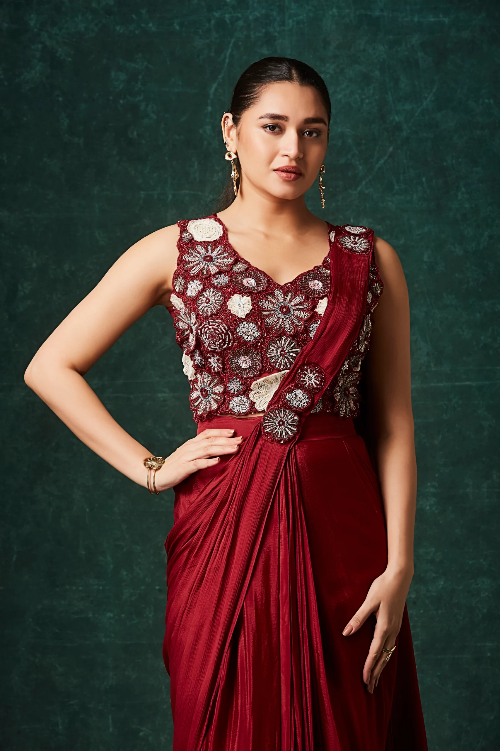 Command attention with effortless elegance in our Ruby Crimson Embroidered Pre-Draped Saree Set — a bold celebration of modern glamour rooted in timeless Indian aesthetics.