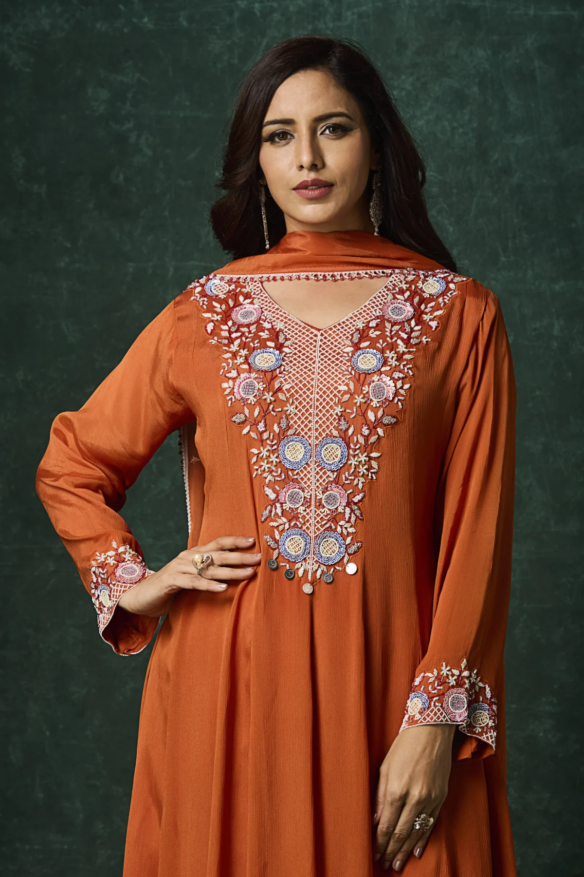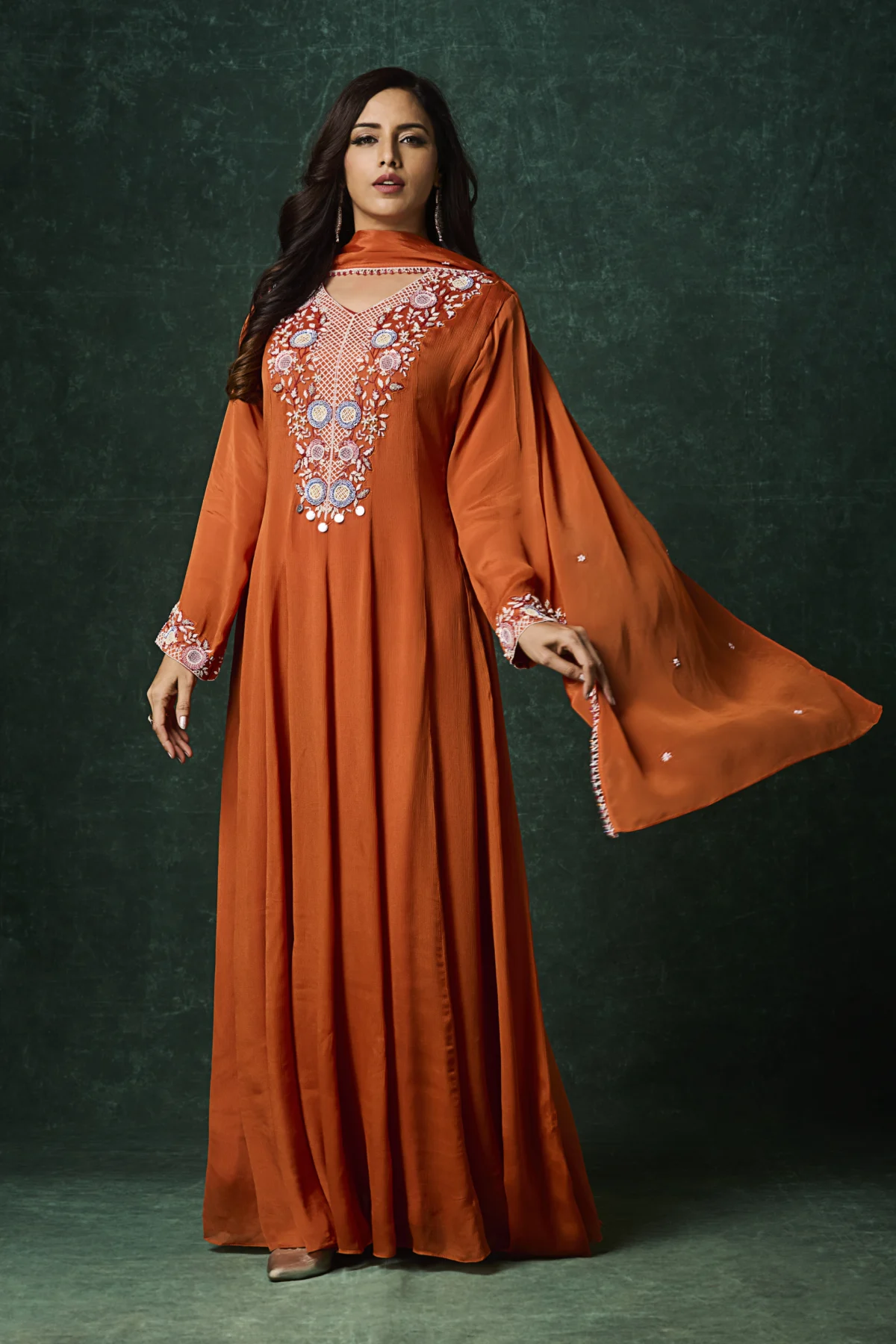 Rust Embroidered Indo-Western Long Kurta Dress with Dupatta