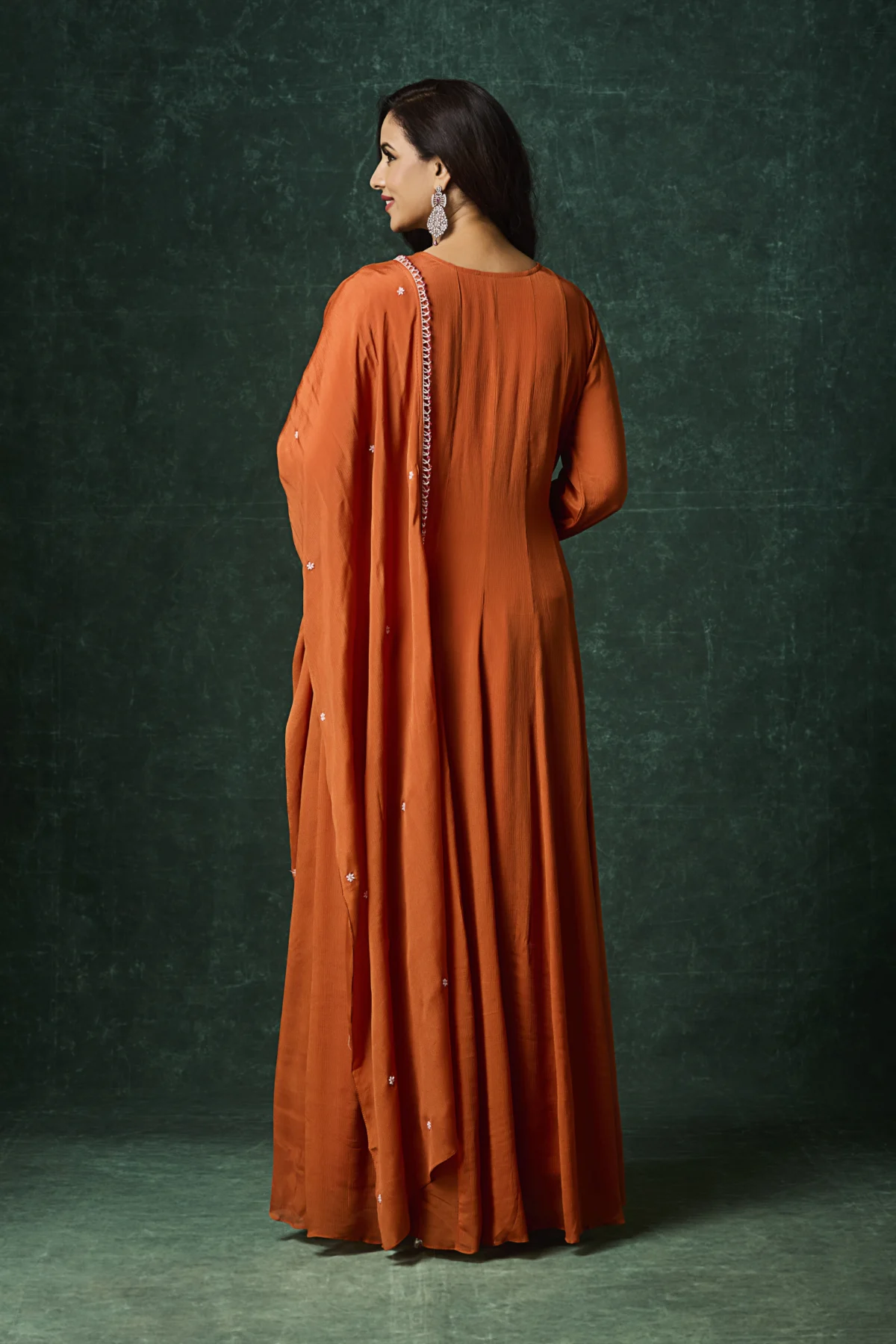 A rust-colored embroidered Indo-Western long kurta dress with a flowy silhouette and matching dupatta, perfect for festive and elegant occasions.