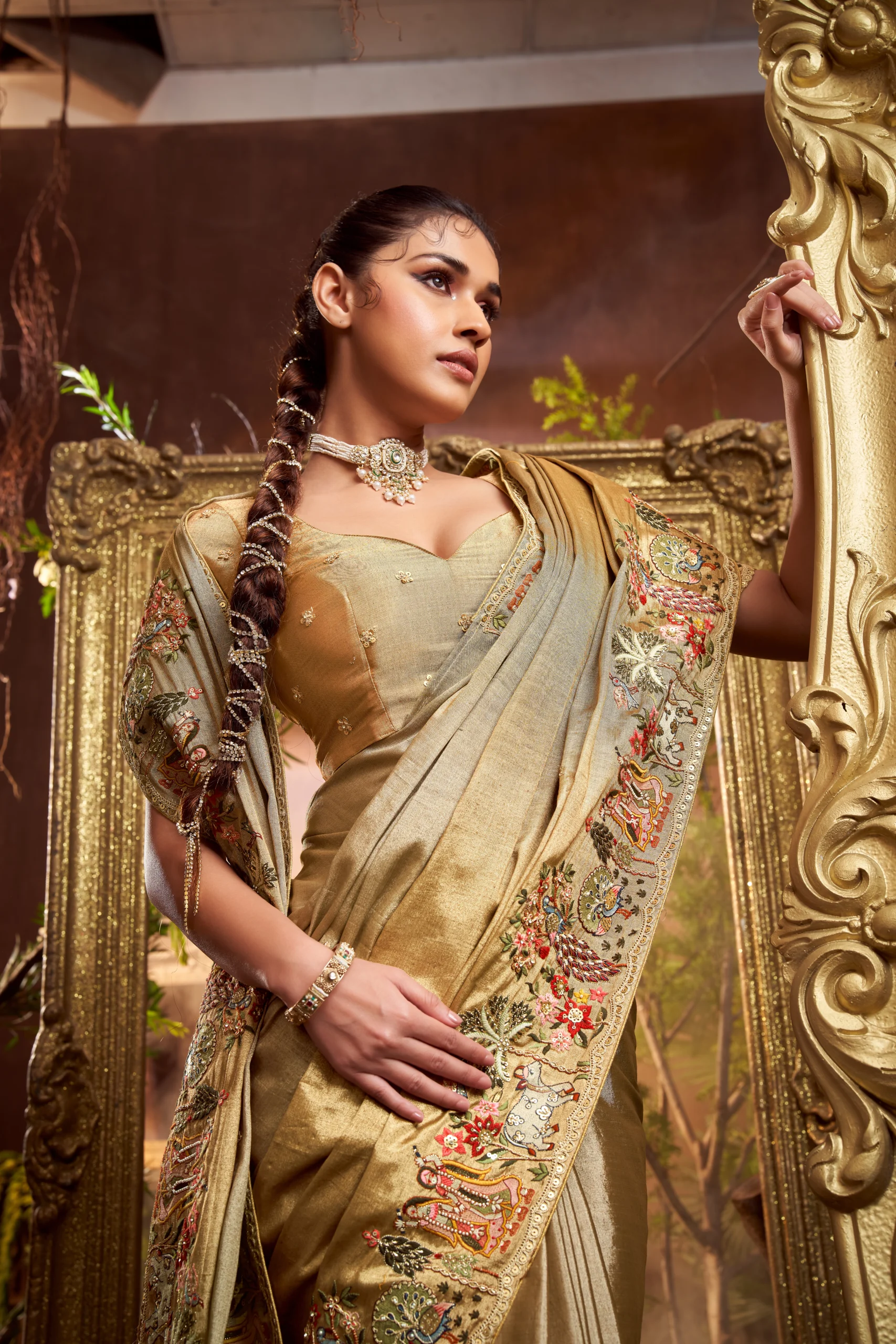 Step into a realm of unparalleled grandeur with the Swarna Yatika Saree, a masterpiece designed for the woman who commands the room. This isn’t just a saree; it is wearable art that bridges the gap between ancient royal heritage and contemporary glamour.