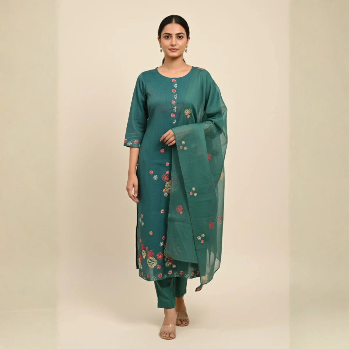 A luxurious blue-green Chanderi suit set with elegant embroidery, combining rich fabric sheen and timeless craftsmanship for festive sophistication.
