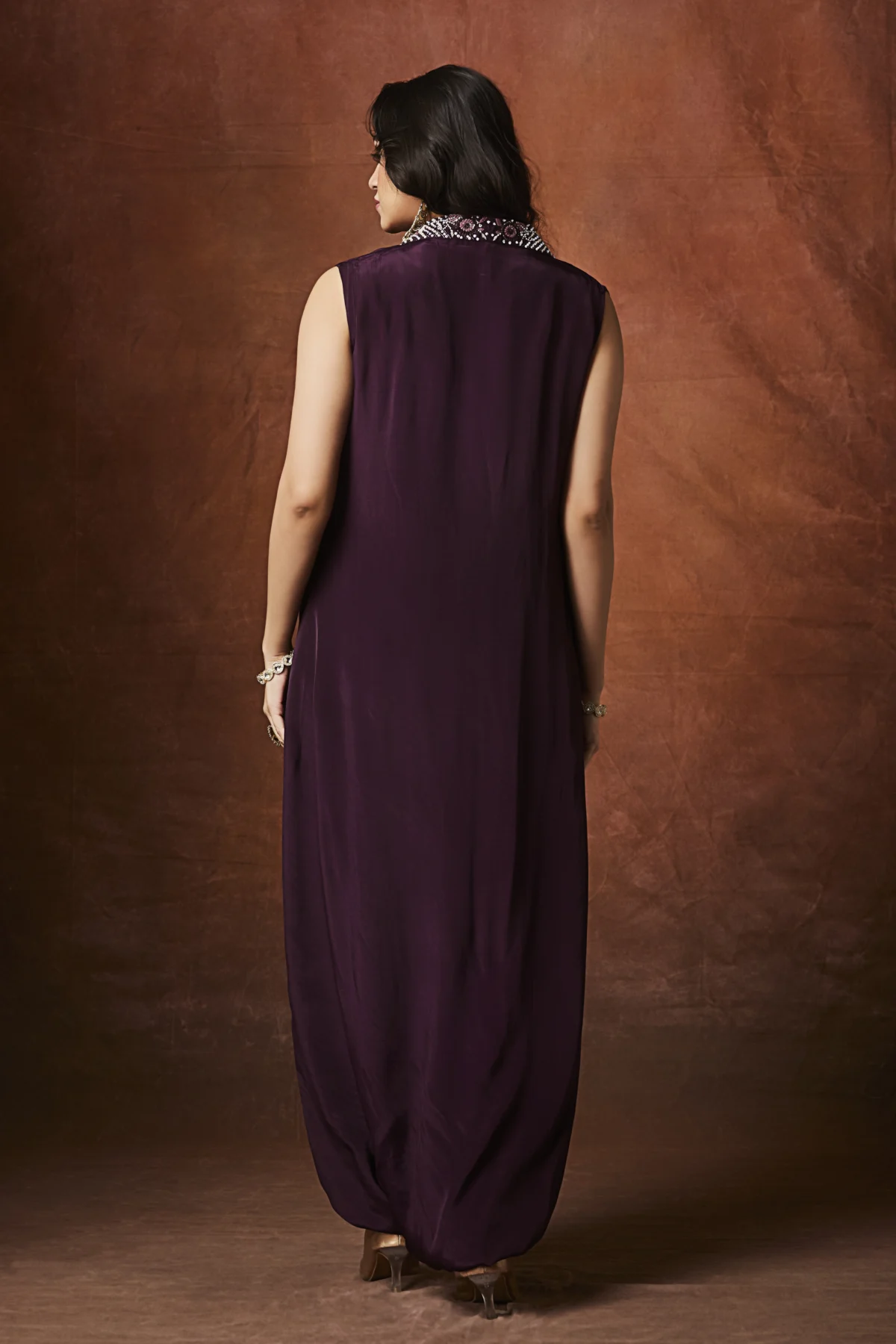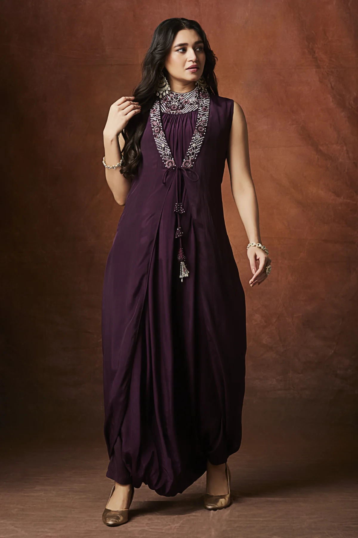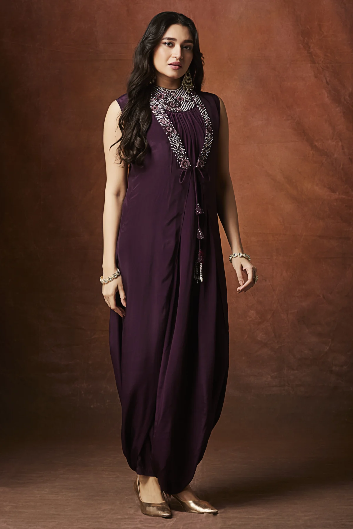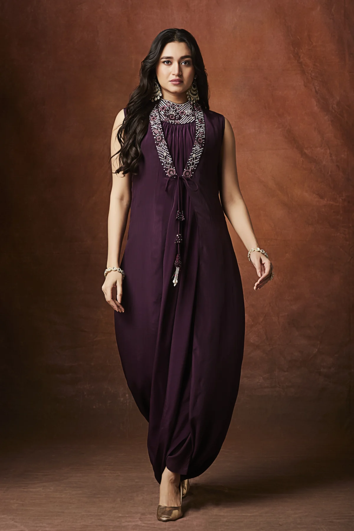 Embellished wine-tone indo-western draped maxi dress with dhoti silhouette.