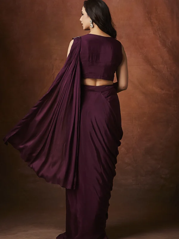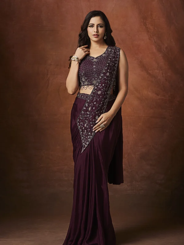 Make an unforgettable style statement with this Wine Elegance Embroidered Draped Saree, crafted for modern women who love timeless glamour with effortless wearability. Designed in a rich wine hue, this pre-draped saree blends traditional craftsmanship with contemporary styling, making it perfect for weddings, cocktail evenings, receptions, and festive celebrations.